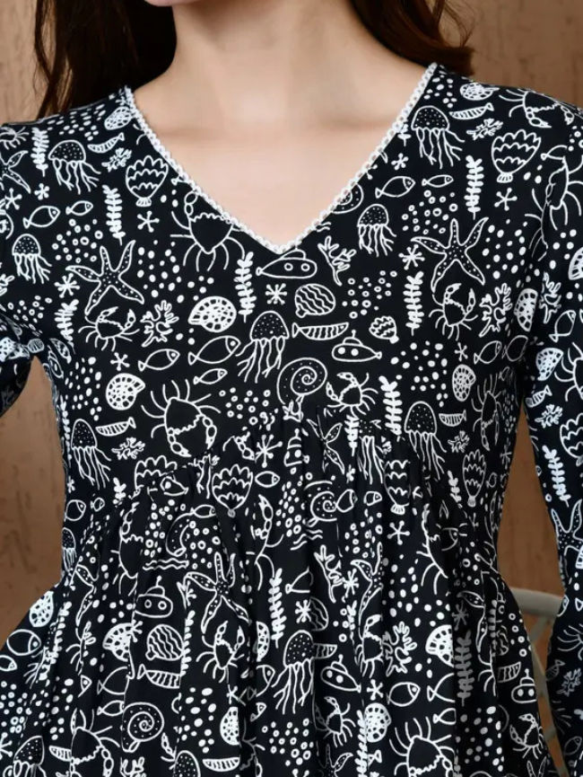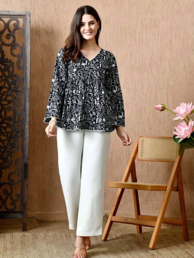 Casual Flared Sleeves Printed, Ethnic Motifs Women Black Top