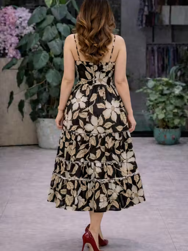 Women Black Floral Printed Midi Dress | Stylish Sleeveless Party Wear Dress for Women | Casual Summer Western Dress | Trendy Layered Fashion Dress for Girls