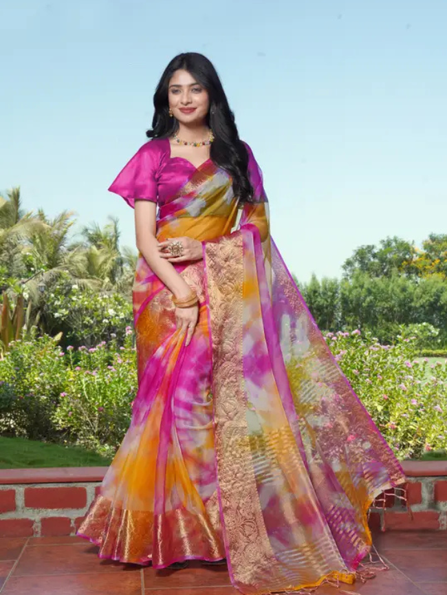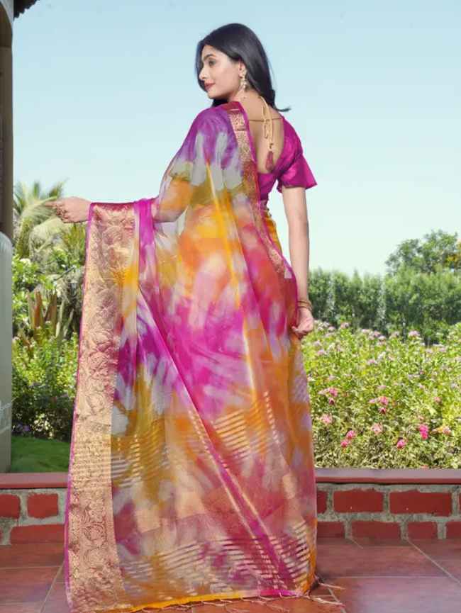 Printed Bandhani Organza Saree (Pink)