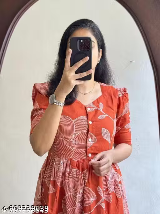 Women Rust Orange Floral Printed Midi Dress with Puff Sleeves