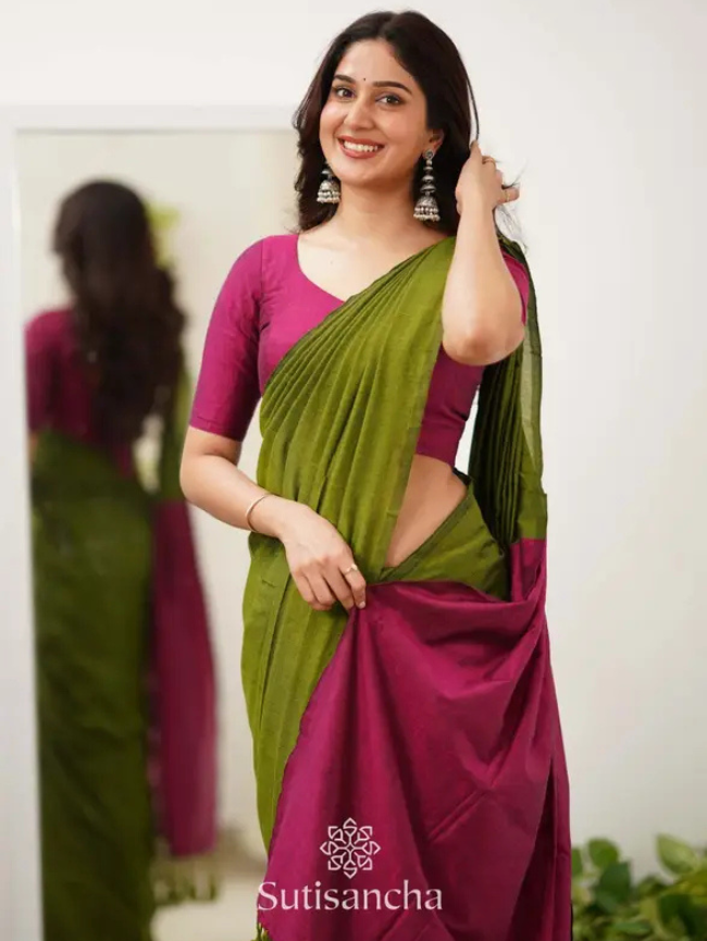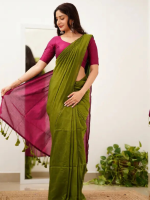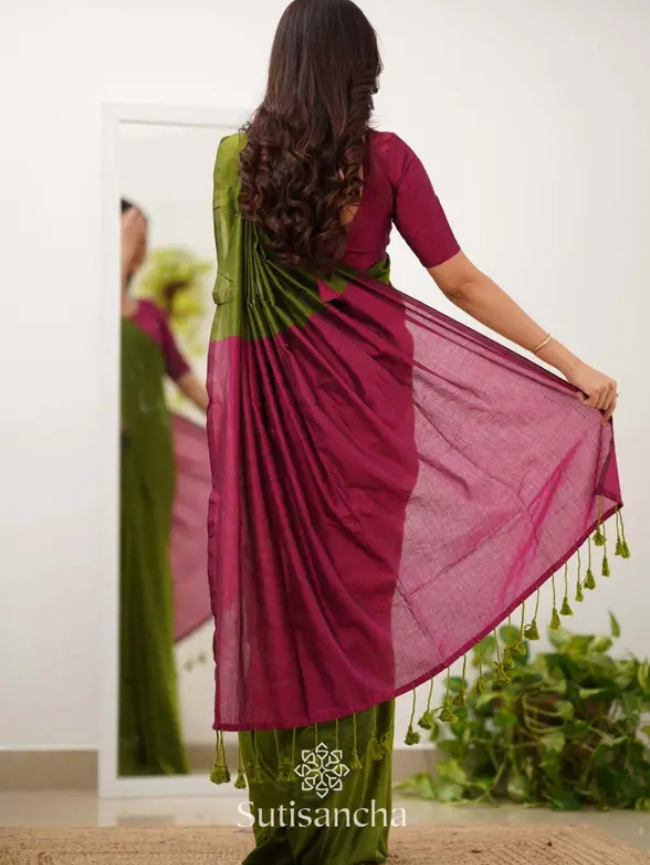 Woven Handloom Handloom Cotton Blend Saree (Dark Green, Pink)
