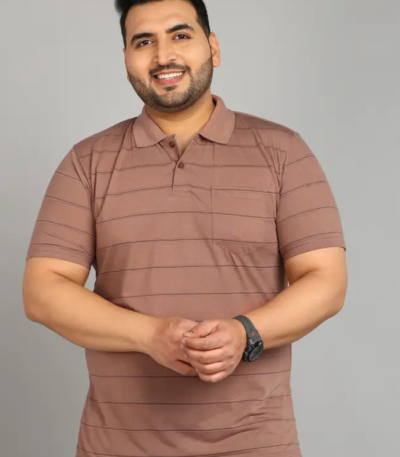 Plus Size Men Striped Polo Neck Cotton Blend Beige T-Shirt