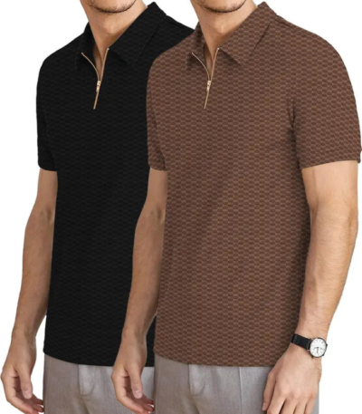 Pack of 2 Men Self Design Zip Neck Polyester Black, Brown T-Shirt